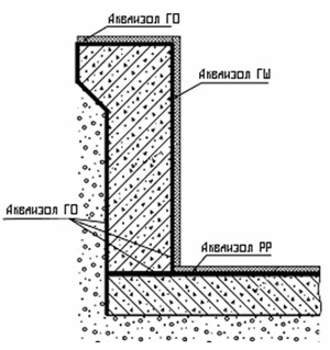 2. Очистить поверхности основания в области возведения вертикальных стен. Покрыть область возведения вертикальных стен гидроизоляцией обмазочной Акваизол ГО в 2 слоя.