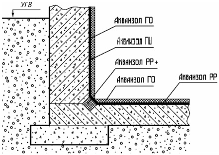 3. Нанести гидроизоляцию обмазочную Акваизол ГО в три слоя методом «свежее по свежему». Толщина одного слоя не должна быть меньше 1,5 мм.
